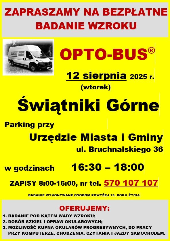 Plakat z zaproszeniem na bezpłatne badanie wzroku OPTO-BUS