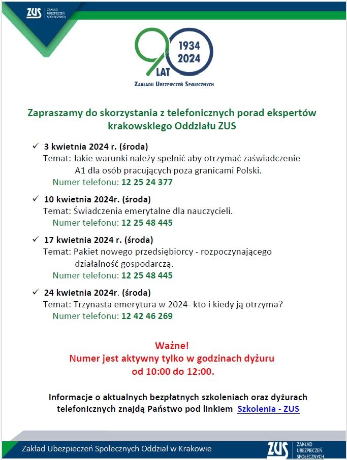 Ważne! Numer jest aktywny tylko w godzinach dyżuru od 10:00 do 12:00. Informacje o aktualnych bezpłatnych szkoleniach oraz dyżurach telefonicznych znajdą Państwo pod linkiem Szkolenia - ZUS