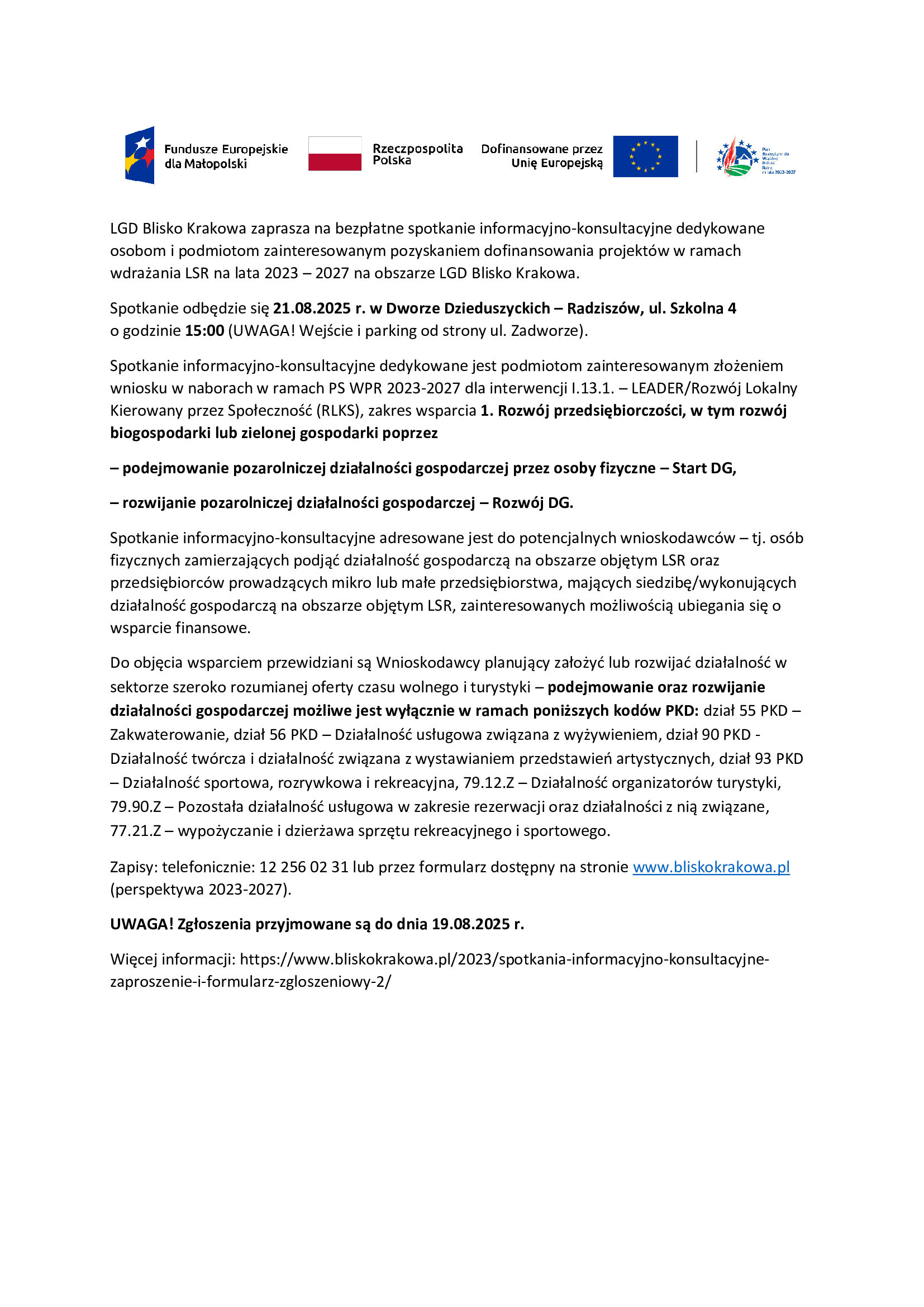 LGD Blisko Krakowa zaprasza na bezpłatne spotkanie informacyjno-konsultacyjne dedykowane osobom i podmiotom zainteresowanym pozyskaniem dofinansowania projektów w ramach wdrażania LSR na lata 2023 – 2027 na obszarze LGD Blisko Krakowa.