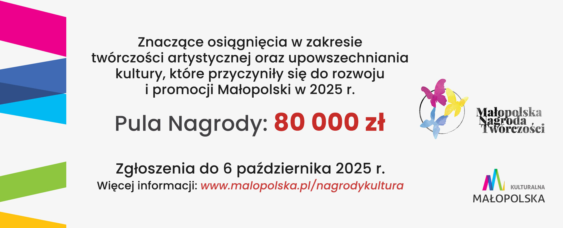Małopolska Nagroda Twórczości – dla artystów i twórców promujących Małopolskę i jej dziedzictwo. Pula nagród: 80 000 zł.